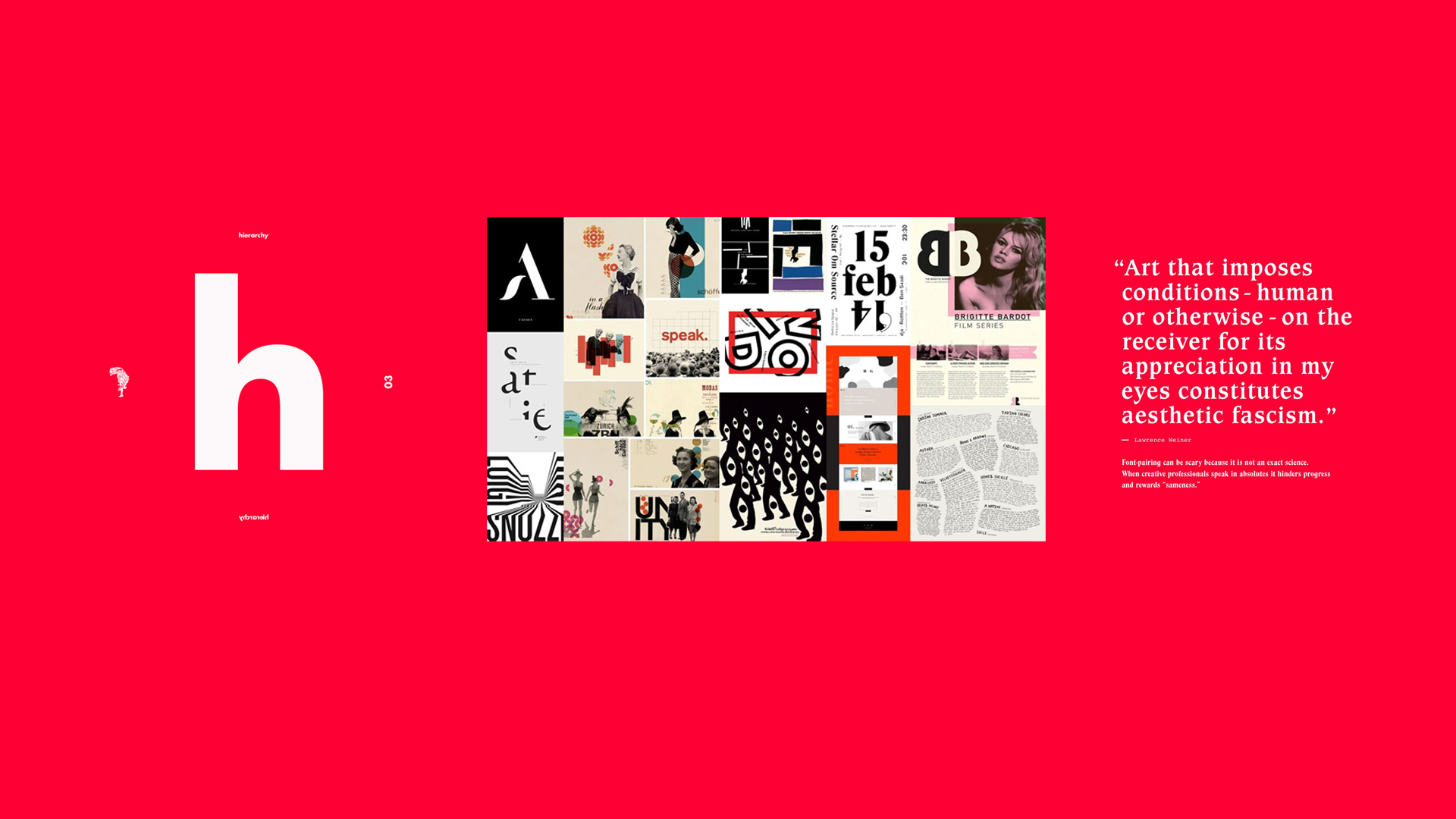 • Don’t Be Afraid to Experiment or break the rules. This is how we learn. Font pairing can be scary because it is not an exact science, but when creative professionals speak in absolutes, it hinders progress and rewards “sameness.”